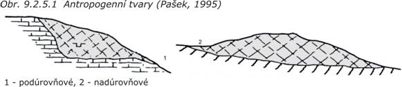 Antropogenní tvary jsou odrazem přemodelování krajiny lidskou činností a to zejména různými úpravami při výstavbě a těžbě nerostných surovin aj. Podle vztahu k původnímu reliéfu je lze rozdělit na nadúrovňové a podúrovňové (obr. 9.2.5.1), podle kvality na negativní (skládky odpadu, poddolovaná území, obr. 9.2.5.2a,b) a pozitivní (komunikace, parkovací plochy, obr. 9.2.5.2c,d), podle druhu na urbanistické (výstavba sídel, obr. 9.2.5.3a), komunikační (výstavba silnic, obr. 9.2.5.3b), industriální (průmyslová činnost, obr. 9.2.5.3c), montánní (báňská a těžební činnost, obr. 9.2.5.3d), agrární (obhospodařování půdy, obr. 9.2.5.3e), militární (vojenská činnost) a pobřežní (ochrana břehů nádrží a řek obr. 9.2.5.3f).
