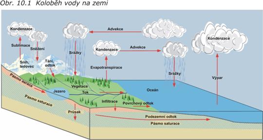 Voda v horninách je součástí hydrosféry. Hydrosféra je veškerá voda v atmosféře, na povrchu Země i v horninách (ať již volná - pohyblivá, tak fyzikálně či chemicky vázaná v minerálech). Jednotlivé složky hydrosféry tvoří systém, který je nejlépe vyjádřen tzv. koloběhem vody na Zemi (obr. 10.1). Z tohoto koloběhu vody vyplývá, že hlavním zdrojem povrchových a podzemních vod jsou atmosférické srážky. Rozčlenění těchto srážek na jednotlivé složky je základem většiny hydrogeologických výpočtů a základem řešení rovnice hydrologické bilance: ( H .... výška vodního sloupce v milimetrech, Grmela, 2004).