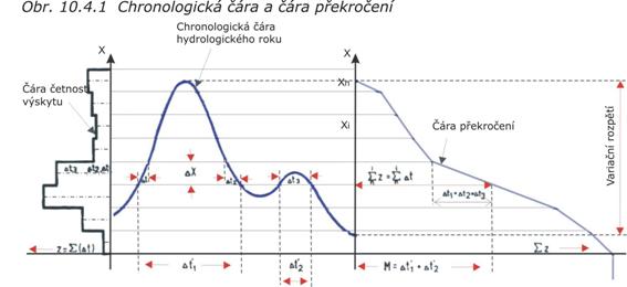 Tato čára se zpracovává na histogram četnosti výskytu daného jevu, resp. na tzv. frekvenční křivku a dále na čáru překročení (obr. 10.4.1), která je důležitým výstupem, udávajícím dosažení nebo překročení hodnoty sledovaného parametru (např. desetiletá voda, stoletá hladina či průtok apod.). Na takového hodnoty jsou pak dimenzovány různé druhy staveb, drenážní systémy, propusti, mosty apod.