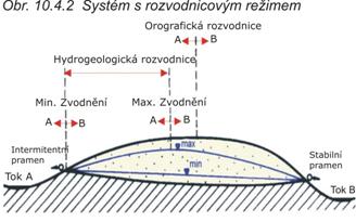 ·   systémy s „rozvodnicovým režimem“ (dotace pouze ze srážek; podzemní vody nekomunikují s povrchovými toky; systém odvodňován prameny, obr. 10.4.2)