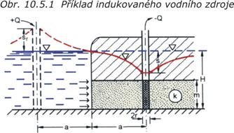 Indukované zdroje jsou definovány jako množství vody přitékající do systému v důsledku uměle vyvolaných změn v dosahu deprese. K vyvolání indukovaných zdrojů může dojít např. jestliže deprese vyvolaná odvodňováním stavební jámy dosáhne vodního recipientu (jezero, řeka). Výsledný efekt je jednak v zastavení šíření deprese v tomto směru a jednak takový, jako by existoval zrcadlově umístěný fiktivní objekt s nálevem rovným vydatnosti čerpání (viz obr. 10.5.1)