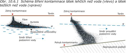 Znečištění je jakákoliv změna v jakosti podzemní vody omezující současné nebo její výhledové využití, resp. zvyšující nároky na její technologickou úpravu, nebo změny v jakosti vedoucí k riziku znečištění dalších zvodněných vrstev či znečištění povrchových vod. Způsobují to anorganické a organické látky nepříznivými změnami fyzikálních a senzorických vlastností, toxicitou a dalšími vlastnostmi vyjmenovanými např. ve vyhlášce MŽP č. 339/1997 Sb., radioaktivní látky přirozeného nebo umělého původu, zdraví škodlivé organismy aj. Schéma šíření kontaminace látek je na obr. 10.6.1.
