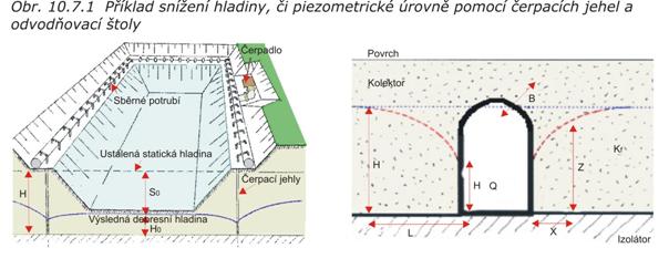 Dále se dosahuje snížení vodní hladiny otevřenými díly (zářezy, rýhy, rigoly) nebo zakrytými díly (drenážní trubky, štěrková drenáž apod.). Při hlouběji zaklesnutých hladinách podzemních vod a u zvodní s napjatou hladinou se snižuje hladina či piezometrická úroveň pomocí čerpání vod z vrtů, čerpání ze soustavy odvodňovacích jehel (speciální úzkoprofilové zarážené nebo vrtané trubky, obr. 10.7.1) nebo odvodňováním pomocí speciálně ražených odvodňovacích štol (obr. 10.7.1) v podloží či ve vlastním zvodněném kolektoru.