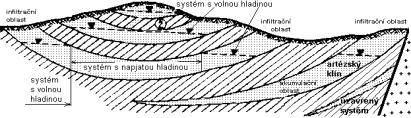 3) bez vodní výměny se zemským povrchem (část zvodní s napjatou hladinou s velmi dlouhou dobou uzavření vod ve struktuře - typické např. synsedimentární fosilní vody).