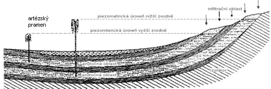 Úroveň podzemní vody, která by se ustálila ve vrtu (studni) se označuje jako tzv. výtlačná nebo též piezometrická úroveň. Podzemní voda v takovémto systému je pod tlakem. Pokud tento tlak by byl tak velký, že piezometrická úroveň by byla nad terénem, pak voda vytéká z vrtu samovolně (artézský vrt, artézský systém) – viz obr. artézského pramene.