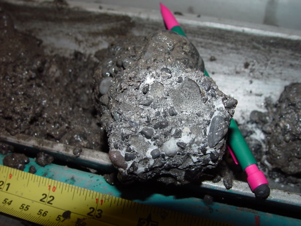 Mořské hydráty metanu získané ve vrtném jádru. Mexický záliv, Atlantický oceán. Foto s laskavým svolením U.S. Geological Survey (Woods Hole Science Center).