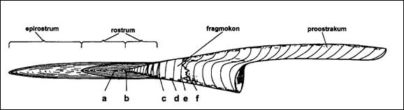 schránka belemnita: a – osová linie, b – protokoncha, c – kamerální uloženiny,
