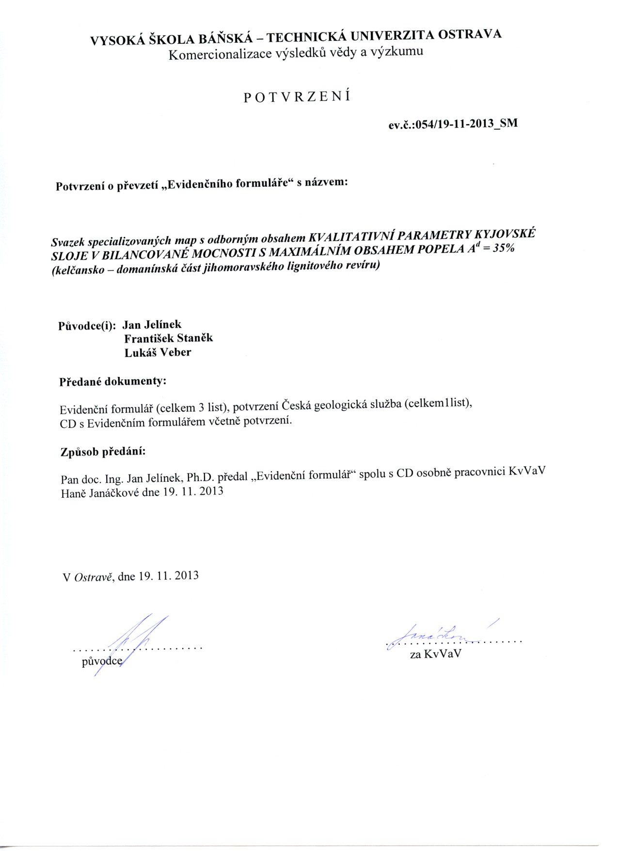 Protokol o převzetí výsledků do evidence VŠB - TU Ostrava