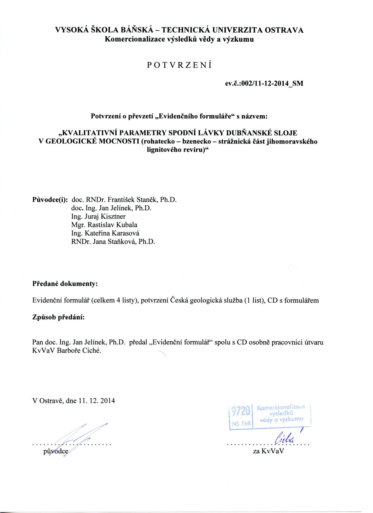 Protokol o převzetí výsledků do evidence VŠB - TU Ostrava
