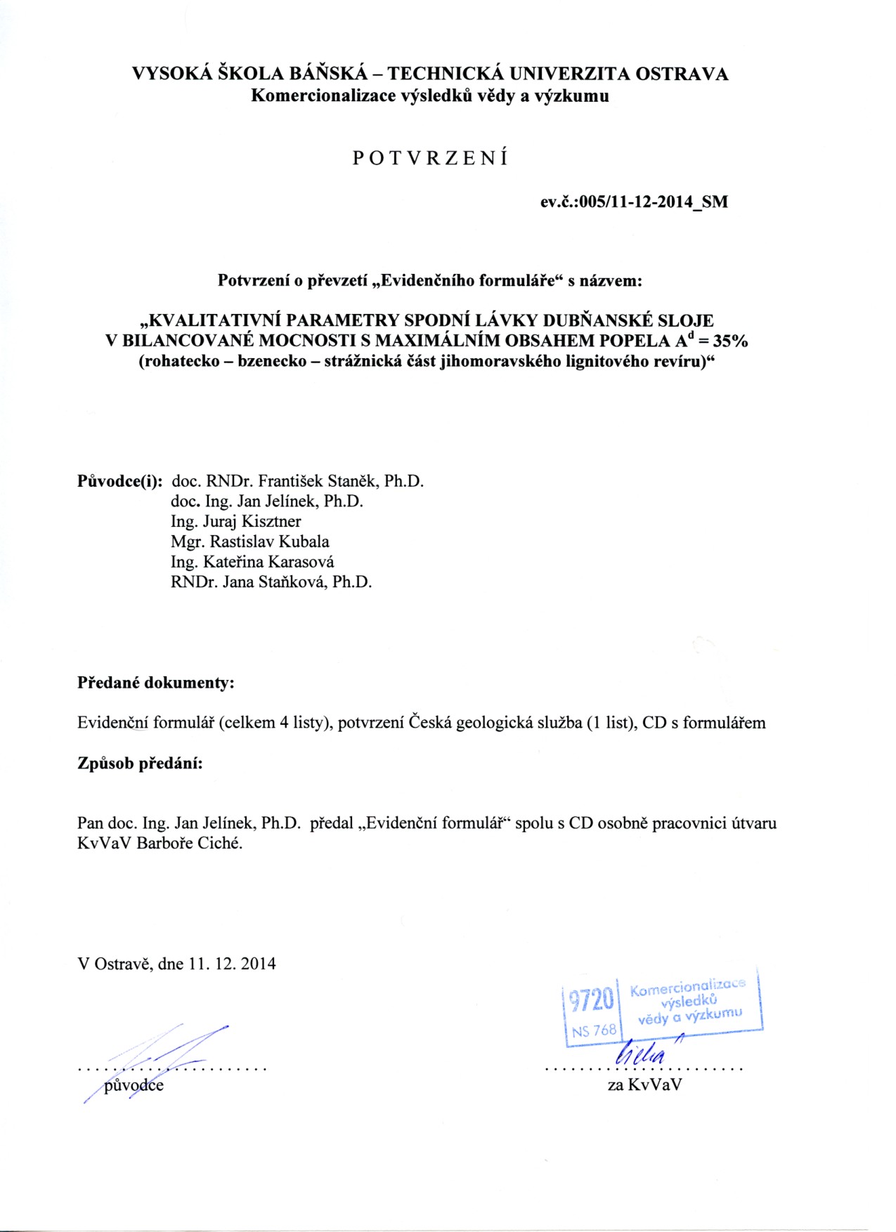 Protokol o převzetí výsledků do evidence VŠB - TU Ostrava