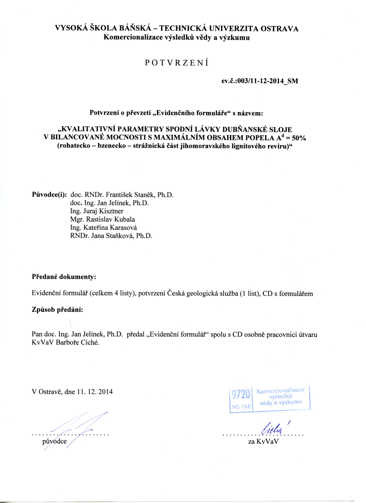 Protokol o převzetí výsledků do evidence VŠB - TU Ostrava